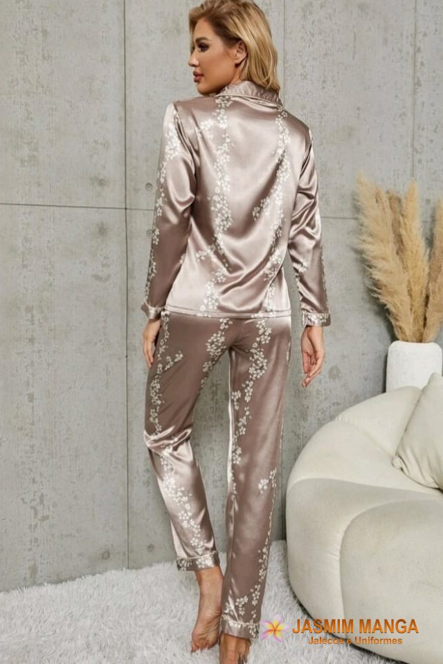 Conjunto de pijama calça e camisa comprida. Tecido cetim floral, gramatura leve. Cor ocre. REF. JASMIM MANGA SIENA