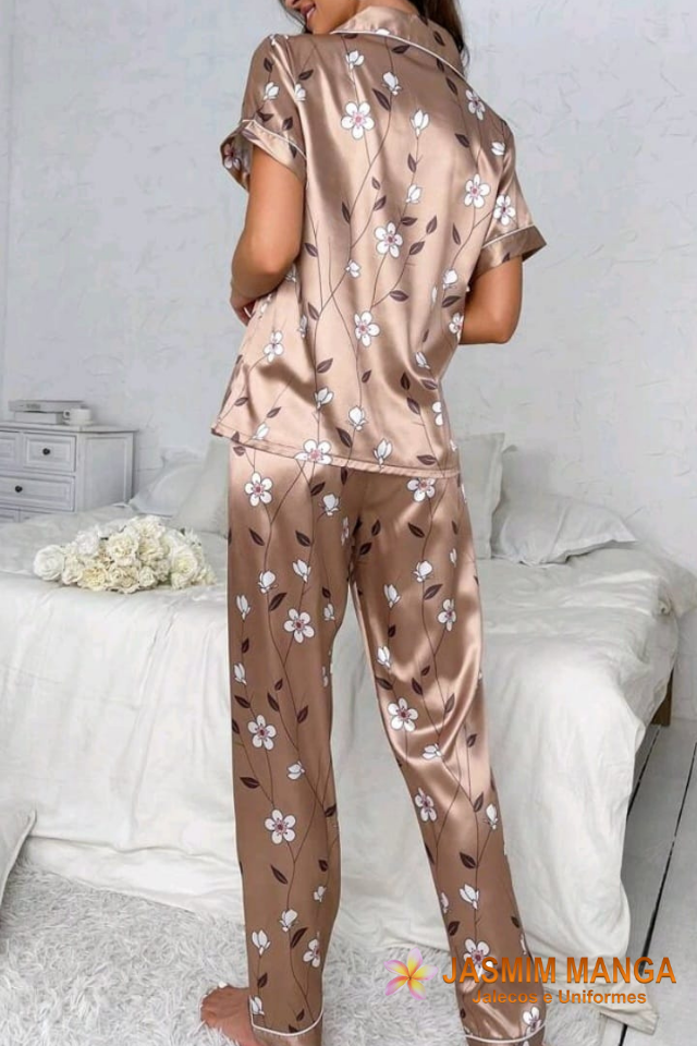 Conjunto de pijama Floral. Tecido cetim, gramatura leve.