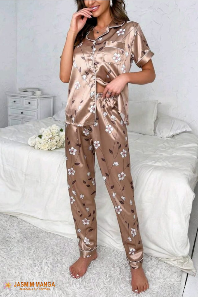 Conjunto de pijama Floral, calça comprida, camisa manga curta. Tecido cetim, gramatura leve, cor ouro velho. REF. JASMIM MANGA OURO VELHO