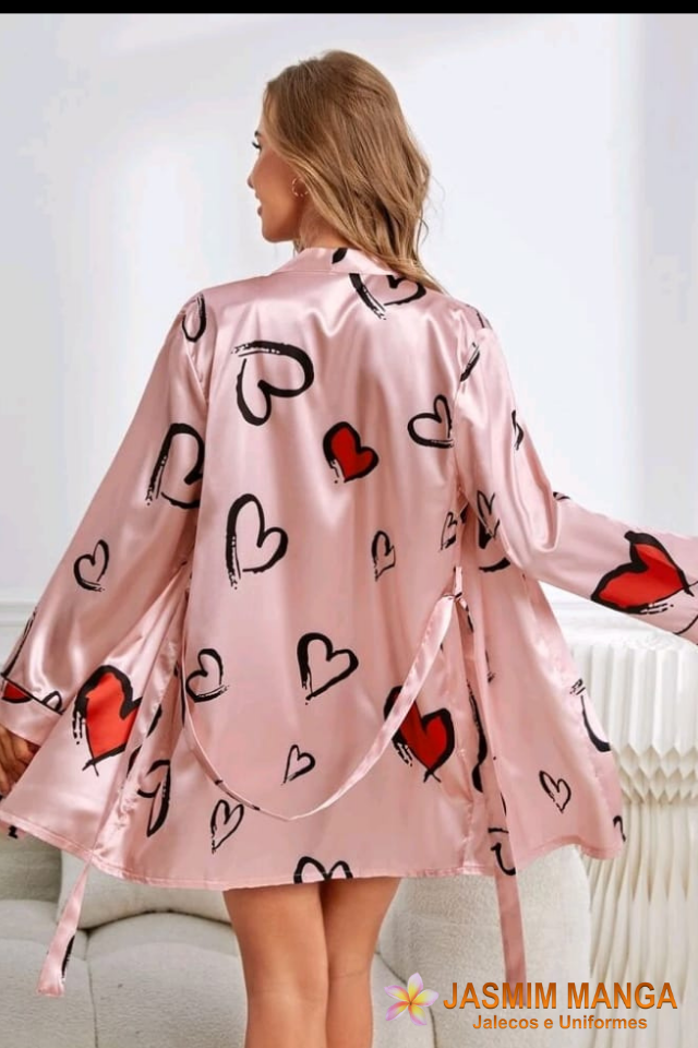 Robe estilo quimono, com cinto, tecido cetim leve, com estampa de coração vermelho.