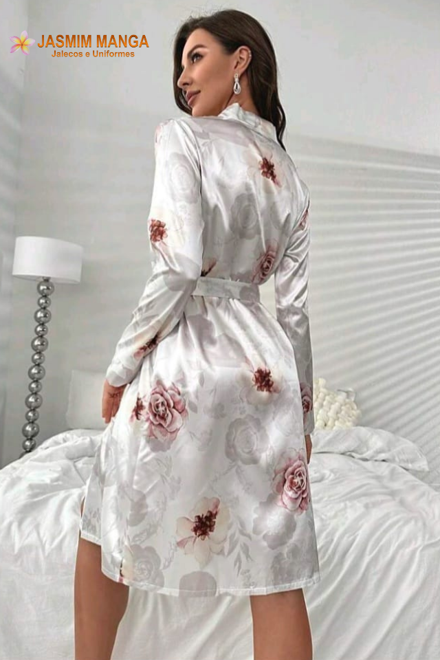 Robe floral, manga comprida. Tecido de cetim, gramatura leve, Cor branca, estampa floral. REF. JASMIM MANGA FLORAL BRANCA